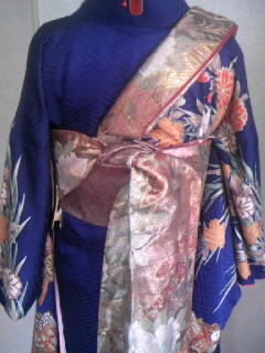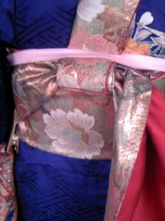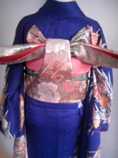 振袖用の袋帯には、たれ先からて先まですべて柄が付いている全通柄と、たれ先から六割だけ柄がついている六通柄があります。 ここでの説明は、六通柄です。 て先から56センチくらいの所まで柄が付いています、ここが一番目の柄止り。そこから先は、胴に巻かれる見えない部分なので柄が付いていません。 二番目の柄止まり、とは、その柄が付いていない箇所が終わる、次の柄が始まる所をさします。 寸法で言うと、て先から大体170センチくらいの所が二番目の柄止まりです。(昔の短い袋帯は、150cm位) | ![]() | |