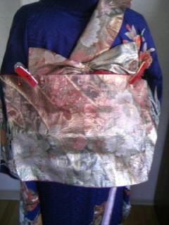 13 帯が全通の場合は、て先を50cmほどを取って左肩に預け、胴に二巻きして一結びした画像です。 上げている、て先を三等分に折り右肩に預けてピンチで止めておきます。 「全通柄を想定して結んでいますから、この帯は、六通柄ですので結び目の下に無地が出ています^_^;」 |